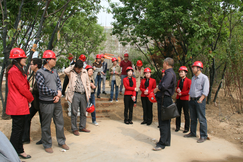首先,置業(yè)公司總工程師張占輝結(jié)合項目工地入口處的幾幅項目效果圖,為大家講解了鴻園項目的概況及特色,又針對大家提出的問題進行了解答。之后,大家走進施工工地,由置業(yè)公司工程管理部經(jīng)理張艷忠?guī)ьI大家參觀施工現(xiàn)場,張經(jīng)理對鴻園項目的建筑特色、選用材質(zhì)、施工進度等進行了講解,大家饒有興致地欣賞著一棟棟風格統(tǒng)一而又不盡相同的建筑,不知不覺間已走近了景觀示范區(qū)。置業(yè)公司設計管理部經(jīng)理付澤江帶領大家穿過隔離網(wǎng),走進景觀示范區(qū),并為大家進行了生動詳盡的講解,漫步在風景迤邐的景觀示范區(qū),聽著付經(jīng)理對于一些景觀特色如“無邊界水景”“臻稀樹種”“原生態(tài)景觀步道”等概念的講解,大家對鴻園項目的景觀特色有了充分的認識和體驗,流連于美景中而徜徉忘返。