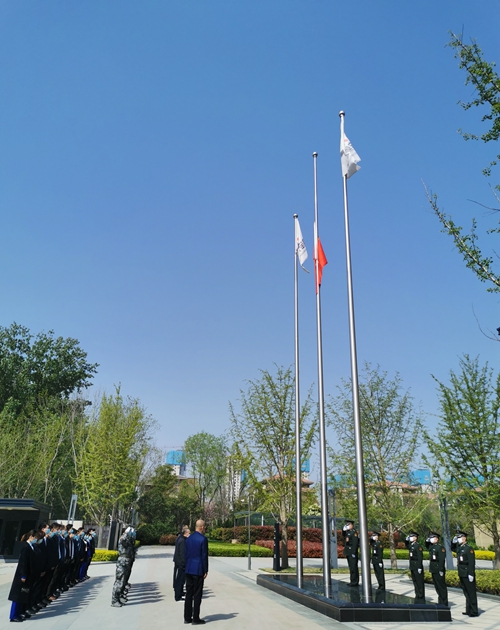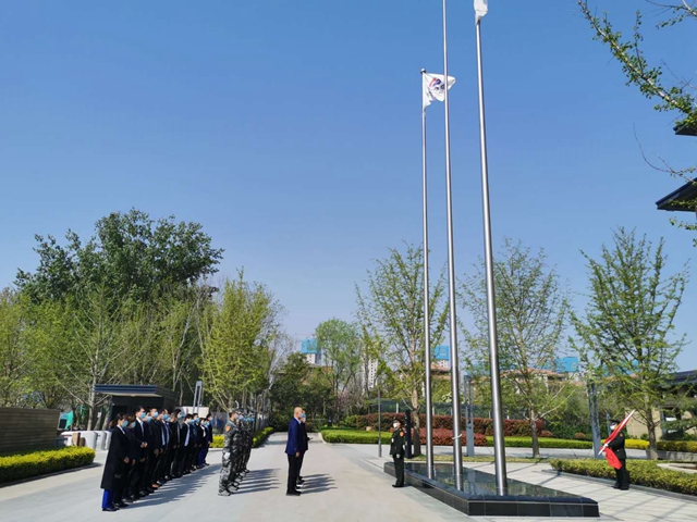 上午10:00,鴻寶集團黨委書記鄧總主持并宣布追悼活動正式開始。集團公司國旗儀仗隊邁著鏗鏘的步伐,舉行下半旗儀式。伴隨著莊嚴肅穆的《義勇軍進行曲》,五星紅旗升至旗桿頂端,短暫定格后,緩緩下降至旗桿三分之一處,隨后鳴響防空警報,全員雙手垂立,低頭默哀三分鐘,用鴻寶人特有的情懷,致敬抗疫英雄,緬懷逝世同胞,以最莊嚴的方式表達深切哀悼。