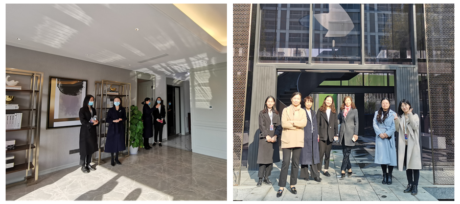 迎著冬日暖陽,全體參觀人員在銀杏苑南門口合影留念,隨后分為兩隊,依次前往洋房精裝樣板間和疊墅清水樣板間參觀。