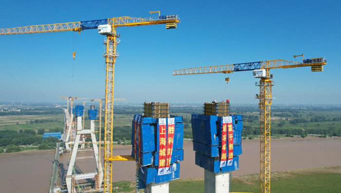蘭封高速東壩頭黃河大橋主橋全長9104米,主橋采用主跨140+360+360+140米的鋼混組合梁三塔斜拉橋設計,塔柱外形為中原鼎型結構,主橋中塔89#墩高達160.5米,分27個節段進行澆筑;兩座邊塔88#墩、90#墩均為154.3米,分26個節段進行澆筑。歷經12個月的日夜奮戰,蘭封高速黃河大橋88#墩主塔26個節段的施工任務提前兩個月完成。