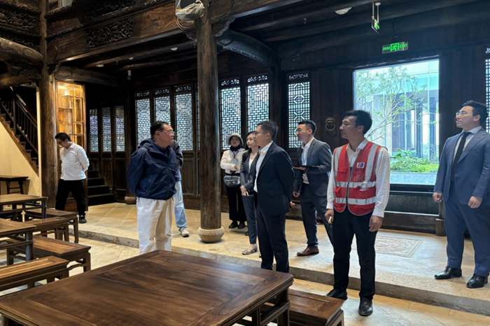 袁董事長先后參觀一樓大堂、二樓餐廳、古建文化空間、16樓樣板間、西塔頂層會所、東塔露臺,詳細詢問了現場工程進度、臺風后維養維修工作,肯定了工程團隊一直以來的努力,囑咐雅詩閣駐店總經理張雪茜要充分利用好東塔會所、西塔樓臺以及古建空間,運用靈活的經營模式為公寓后期的運營增效,通過雅詩閣體系高標準的服務質量鎖住客戶。