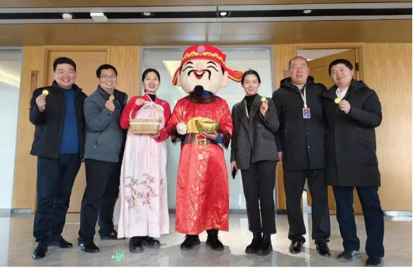 復工首日,鄭州總部園與海南鴻寶總部“夢幻聯動”,組織開展“財神送金”慶祝活動。總部園物業服務中心的“財神爺”與“玉兔仙子”手持鎏金元寶,為鴻寶家人送上金幣巧克力,寓意開門見喜、好運連連;海南鴻寶團隊則帶領“財神爺”在總部樓宇進行新春拜訪并為商戶送上好運金幣,祝愿每一戶商戶財運亨通、事業興旺。